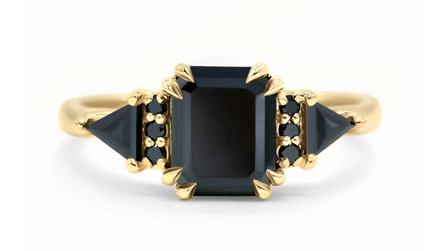Daring and dramatic, this ring features an emerald cut black diamond flanked by round black diamond melee and trillion cut black diamonds set in yellow gold.