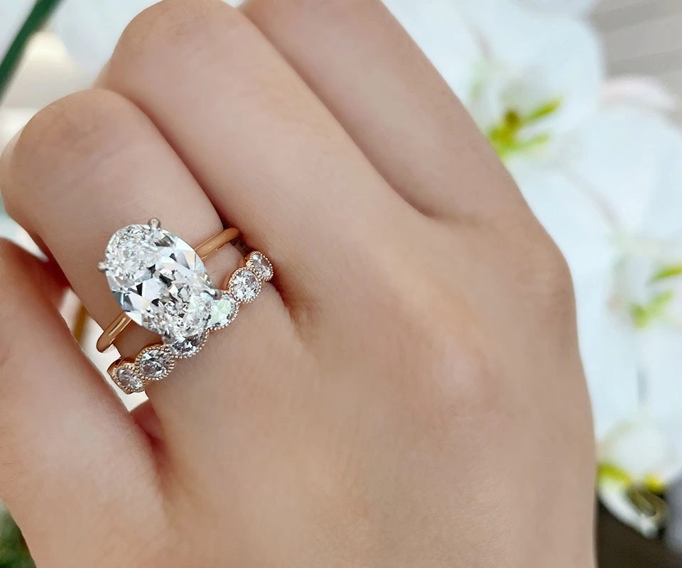 A wedding band can beautifully complement the engagement ring, whether through a contrasting metal tone or the sparkle of melee diamonds.