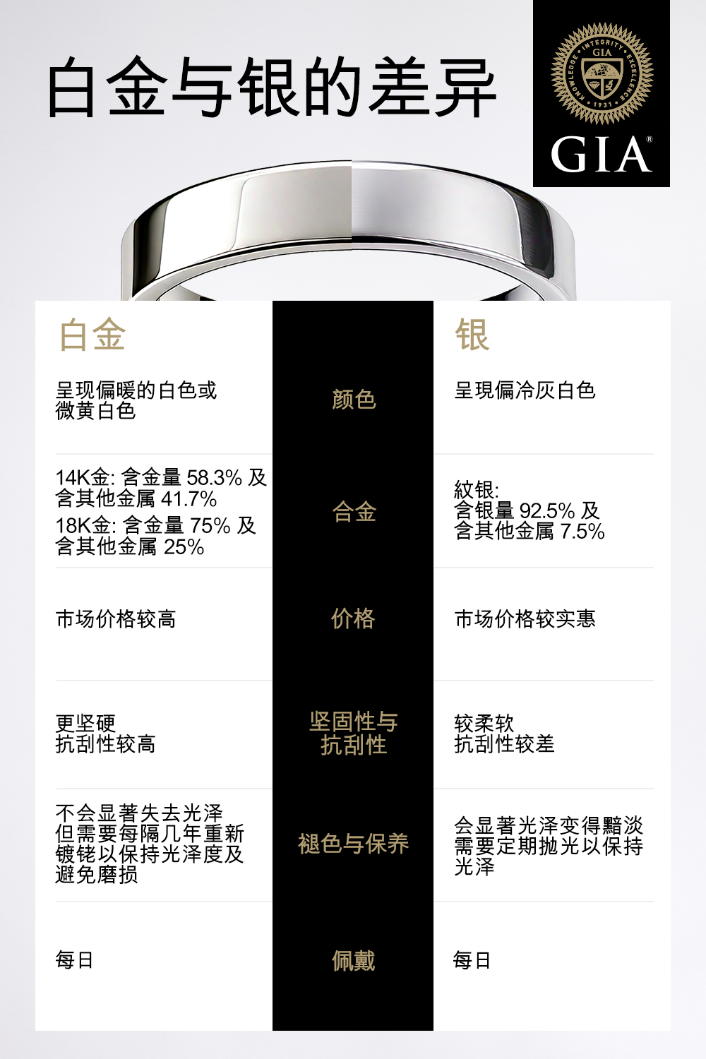在 GIA 的帮助下寻觅完美的白金或银戒指